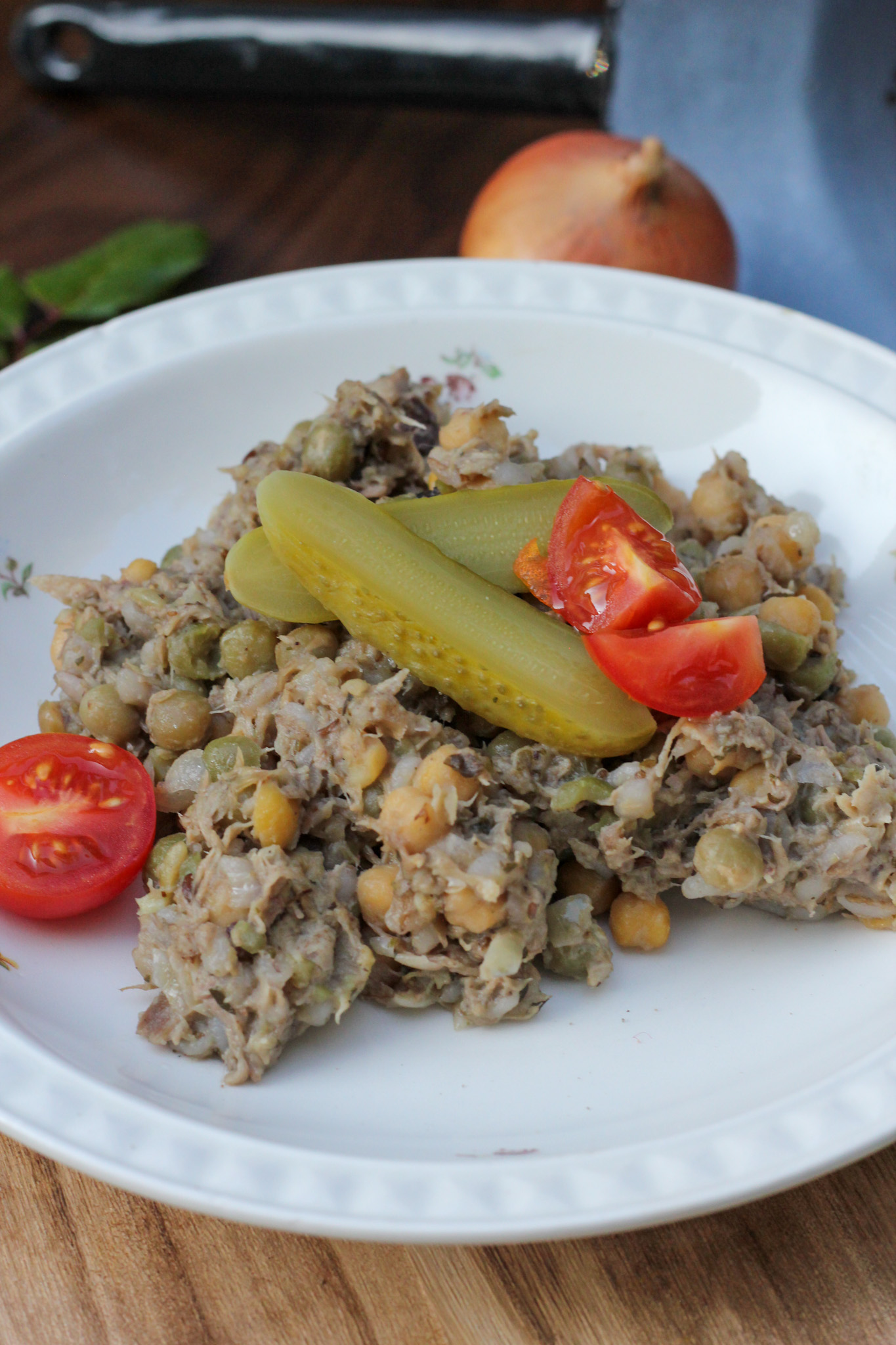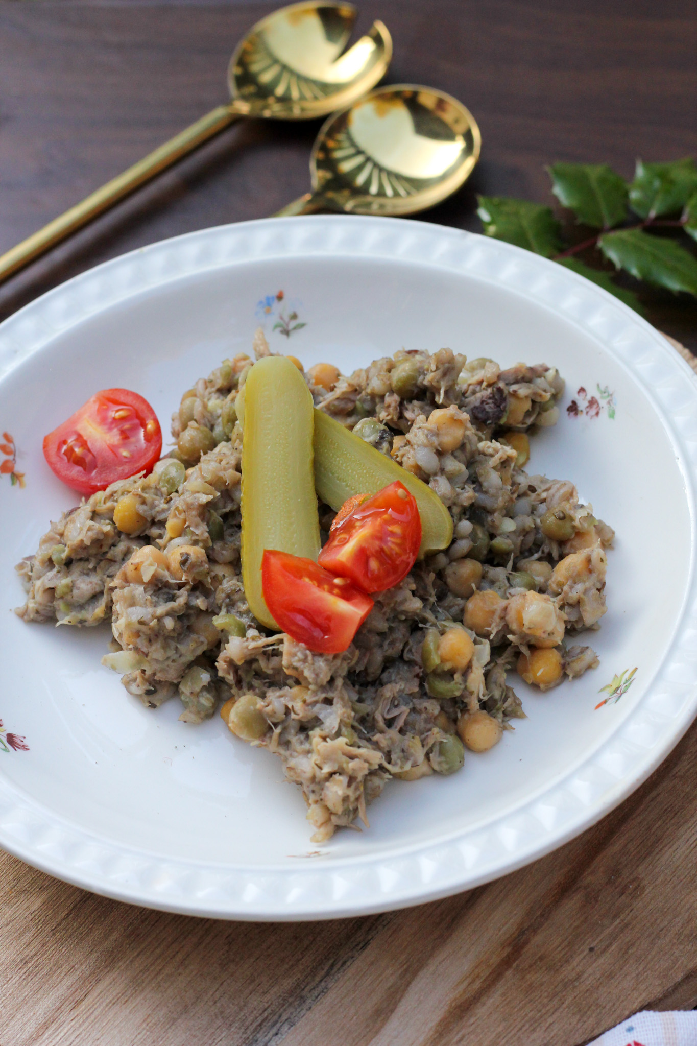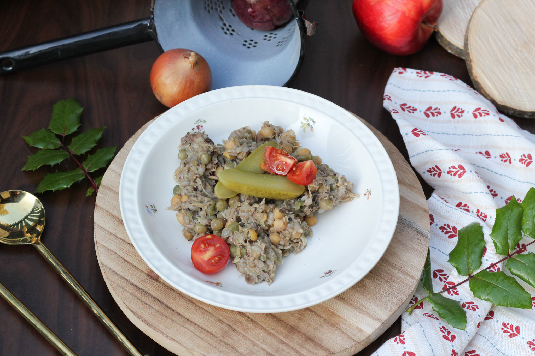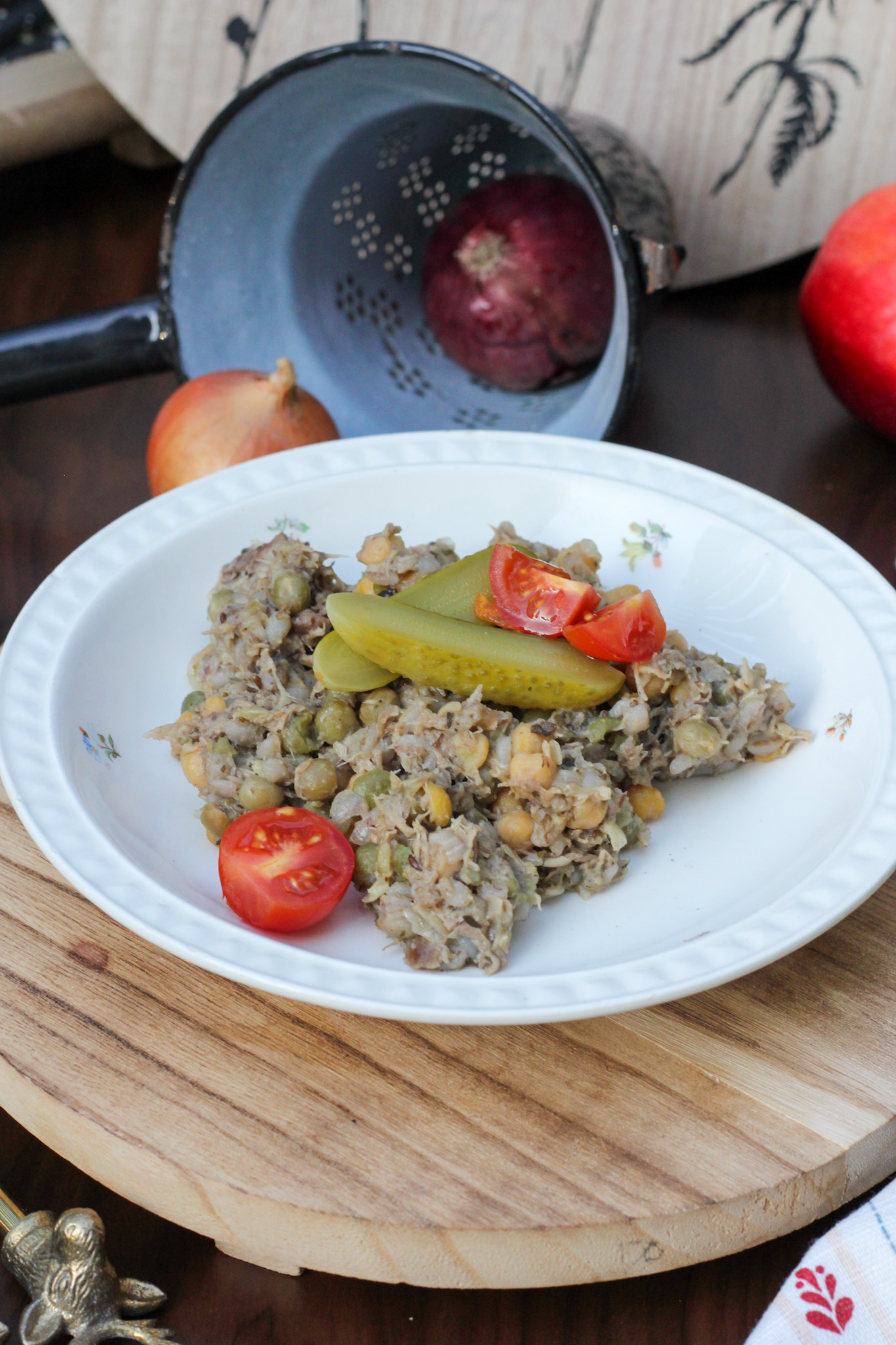 A teď už to bylo celkem rychlé. Přidaly jsme hrách, cizrnu a kroupy, zamíchaly s kousky husy a výpečky, nandaly do pekáčku a daly péct. No jo, jenomže nám začaly haprovat kamna a trouba se dostatečně nezahřála, takže jsme pekáčky vyndaly a druhý den k obědu vše dopekly v remosce… což také nebyla žádná sláva, protože remoska vyhodila pojistky.