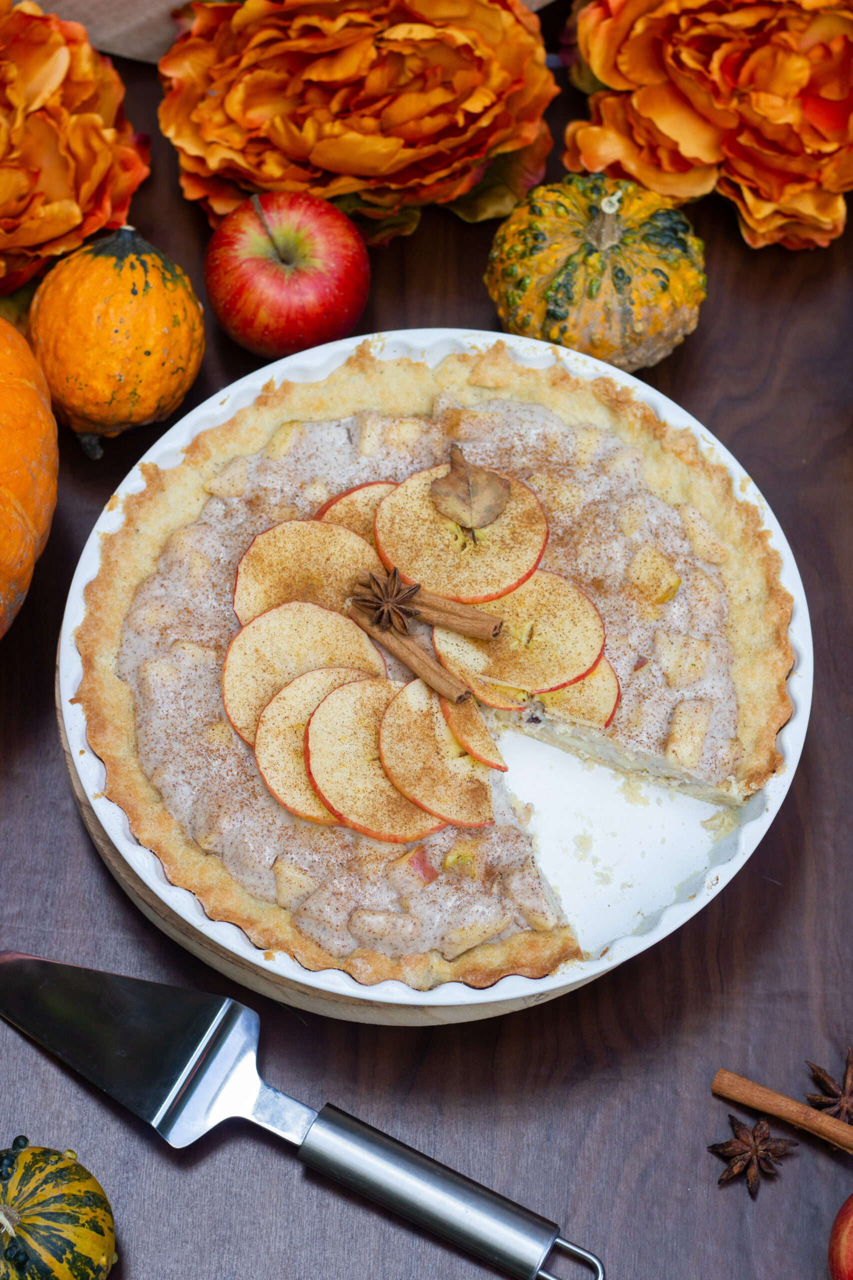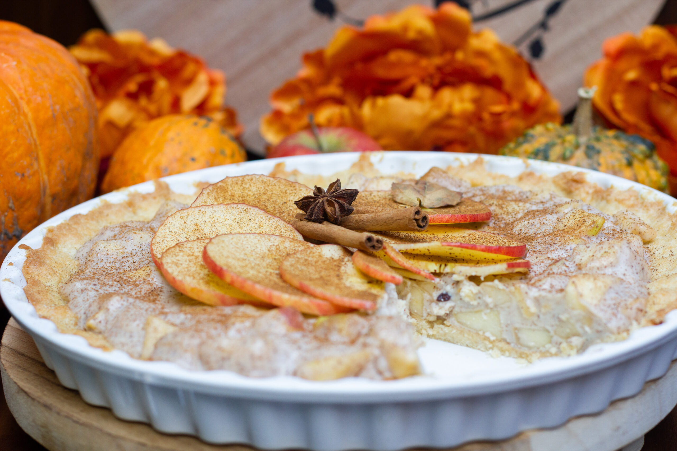 - Upečenou taratletku vyndáme a ještě za tepla vlijeme pudinkovou směs s jablky.