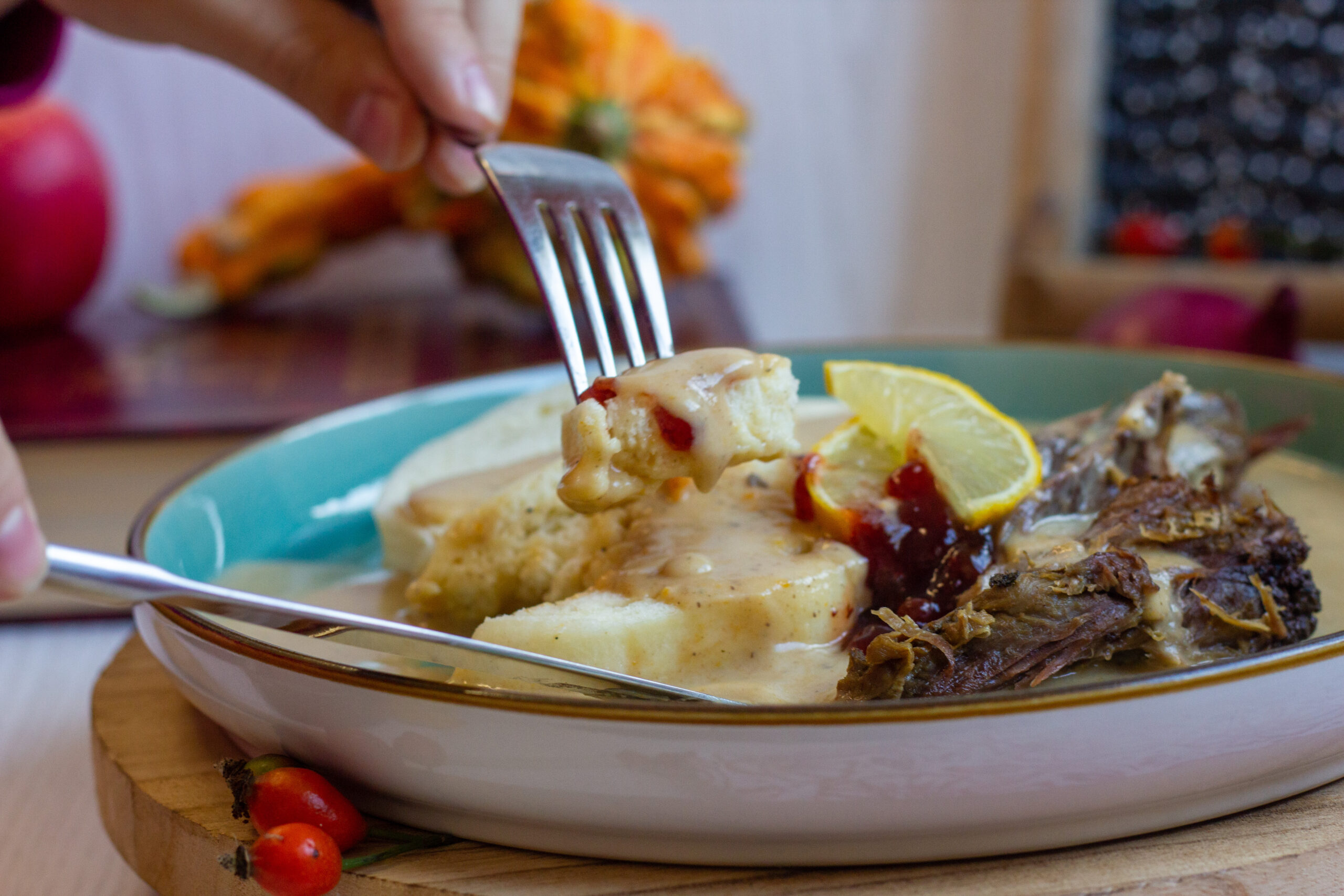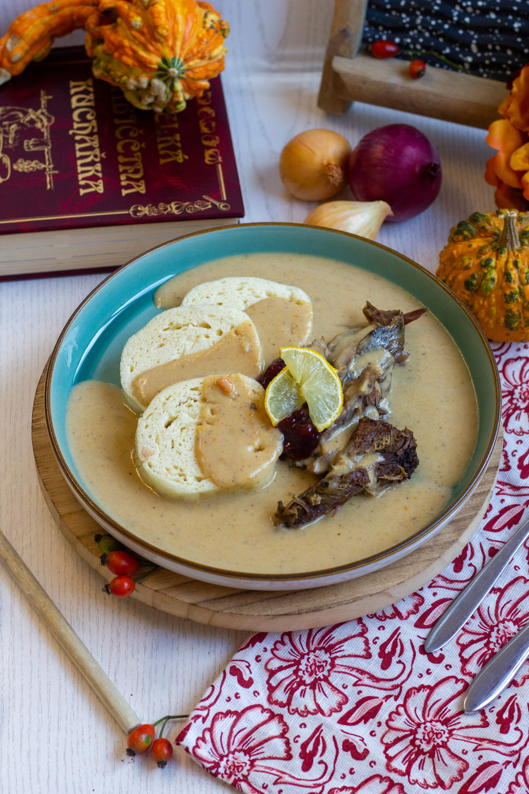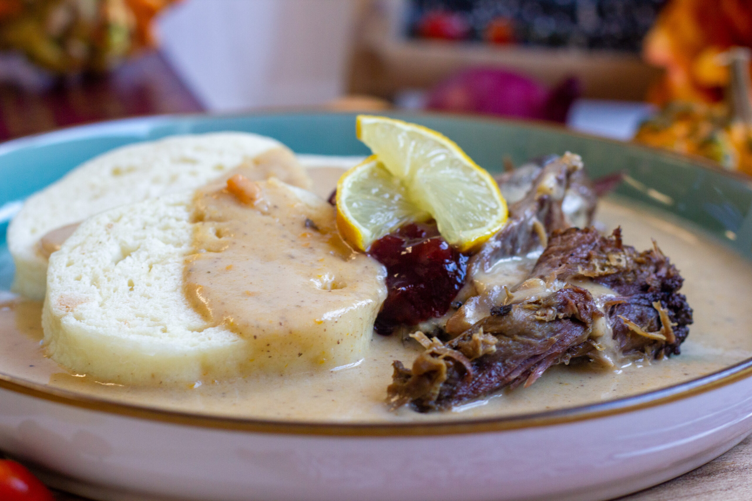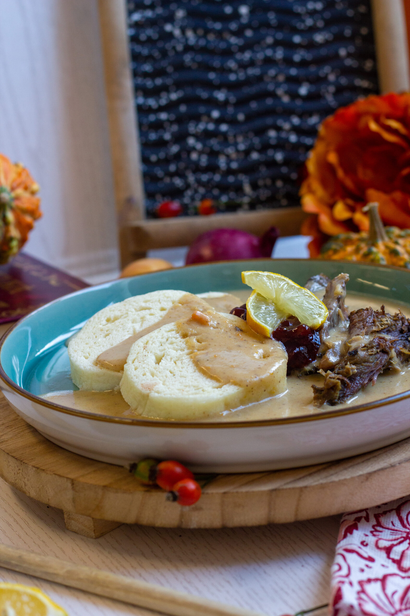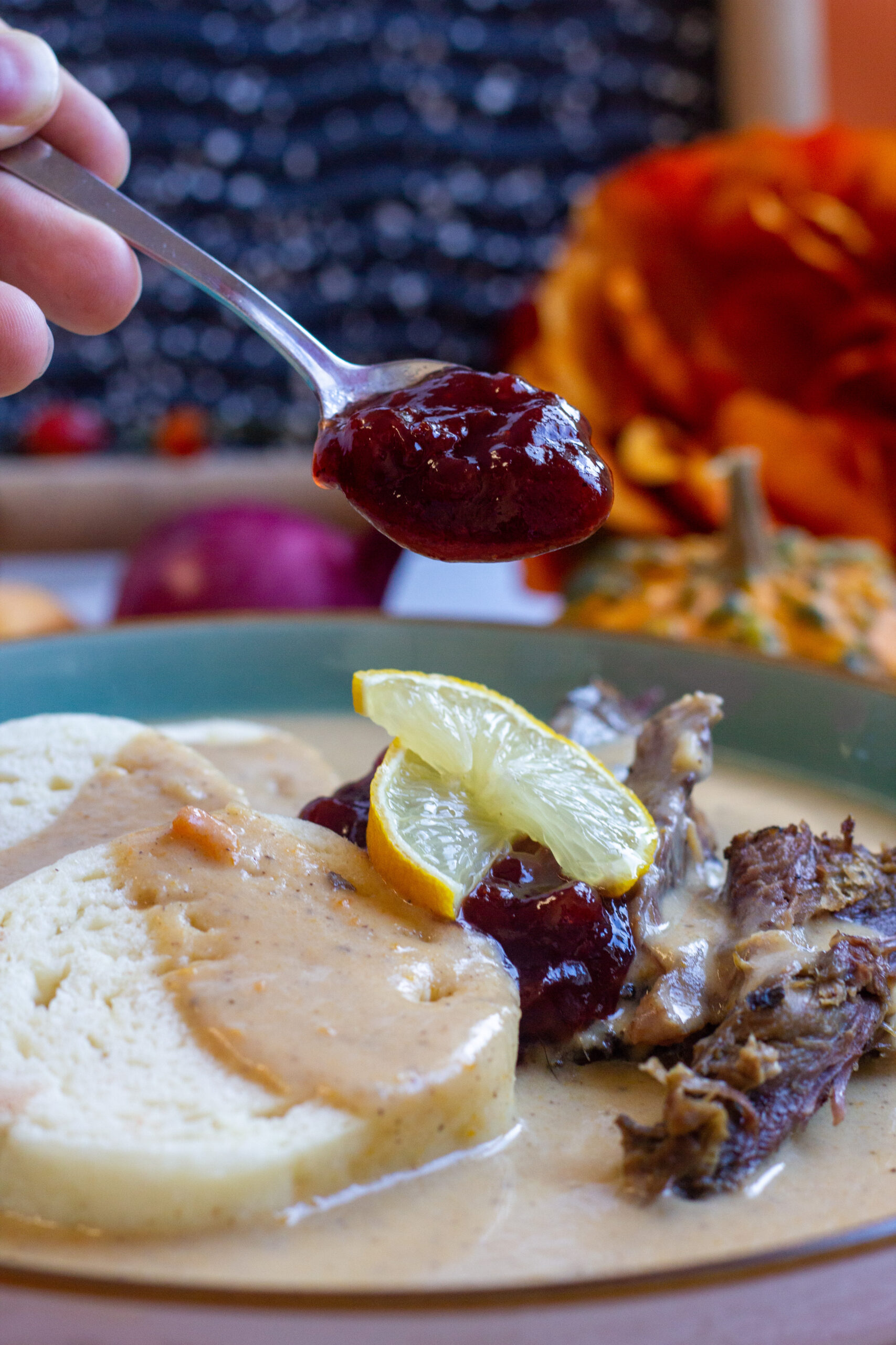 - Maso nakrájíme na plátky, přidáme houskový knedlík, omáčku, brusinky, citrón a můžeme dlabat. Dobrou chuť!